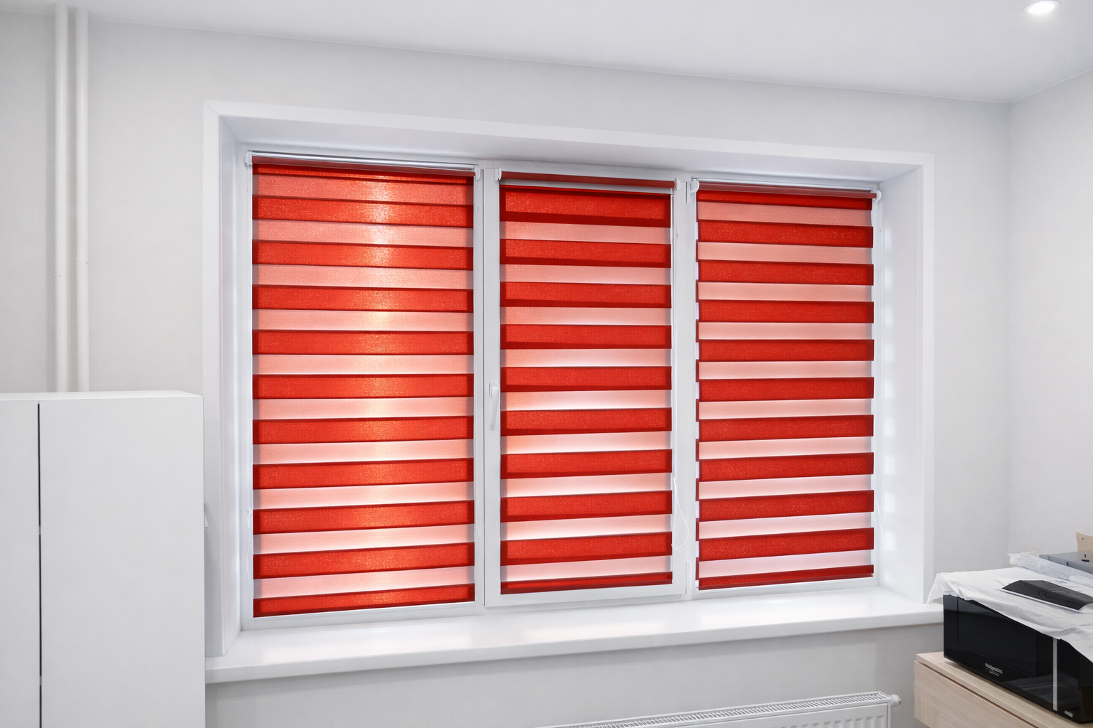 «Зебра» состоит из двух полос: прозрачной и непрозрачной, чередующихся друг с другом. Уникальный механизм позволяет регулировать световой поток за счет совмещения полос. Системы механизмов для «Зебры» бывают как универсальные, так и кассетные, поэтому устанавливать их можно как на проемы, так и на створки пластиковых окон. Минимальный размер 38х38