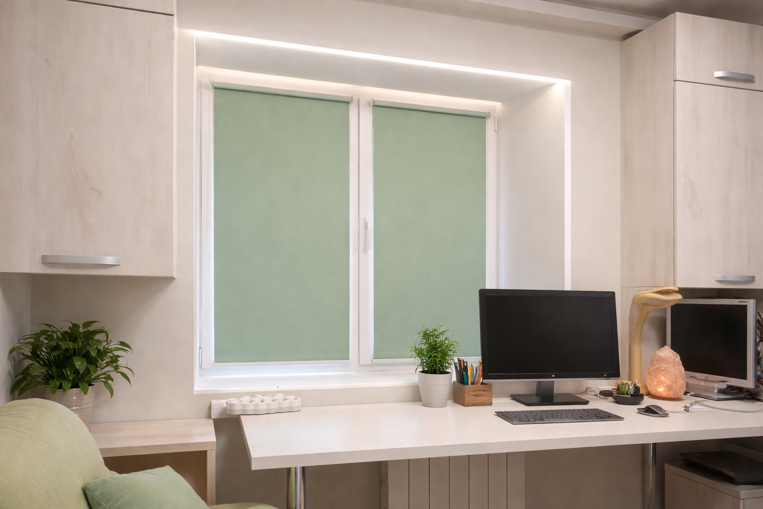 Рулонные шторы уютнее, лучше защищают от света, жары и выглядят современно. При этом жалюзи предпочтительнее для регулировки светового потока, как домашнего, так и офисного стиля